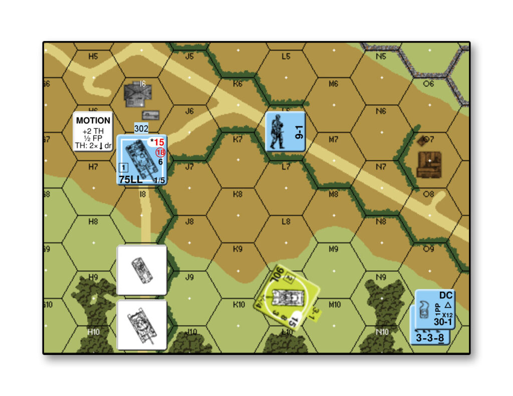 It is the last German MPh. In order for the Germans to win, they must exit Panther 302 off the south edge road hex I10. What does the US player need to score a hit and a kill in hex I9 or I10 assuming the TD already has depleted APCR and no ROF. Your answer can be in fractions (eg. 7/36th TH and 11/36th TK or Shock.