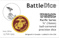 We also made a set of dice for the United States Marine Corps. Although the USMC made up a small part of the overall Allied commitment to the war in the Pacific, they star in numerous ASL scenarios. To date, Multi-Man Publishing has published four historical modules, studies, or mini campaign games for the USMC: Blood Reef Tarawa, Operation Watchtower ((Guadalcanal)), Hell’s Corner (Guadalcanal), and Suicide Creek (New Britain). The white die shows US Marines and a US Navy corpsman raising the US flag on Iwo Jima on 23 February 1945. We debated adding a date or other text, but thought that the image worked best on its own. The saffron (yellow) die is intended to mimic the official colours of the USMC: scarlet and gold. The design is a simplified version of the USMC globe and anchor. The text reads “Semper Fi.”