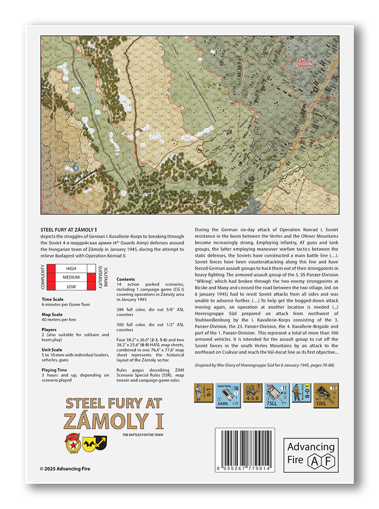 This is the latest in the Advancing Fire Collection depicting the absolute vicious fighting in January 1945 as the SS Wiking Division, the 23 Panzer Division, the 4th Cavalry Brigade, and the 1st Panzer Division try to break through the formidable Russian defenses to reach Budapest. All the while hundreds of fortified positions, anti tank nests, and marauding swarms of advanced Russian armor formations are thrown into the flanks.